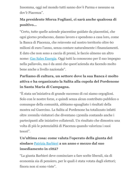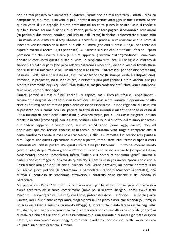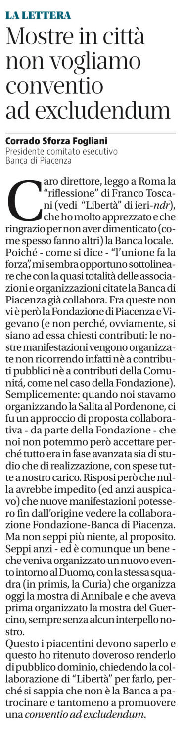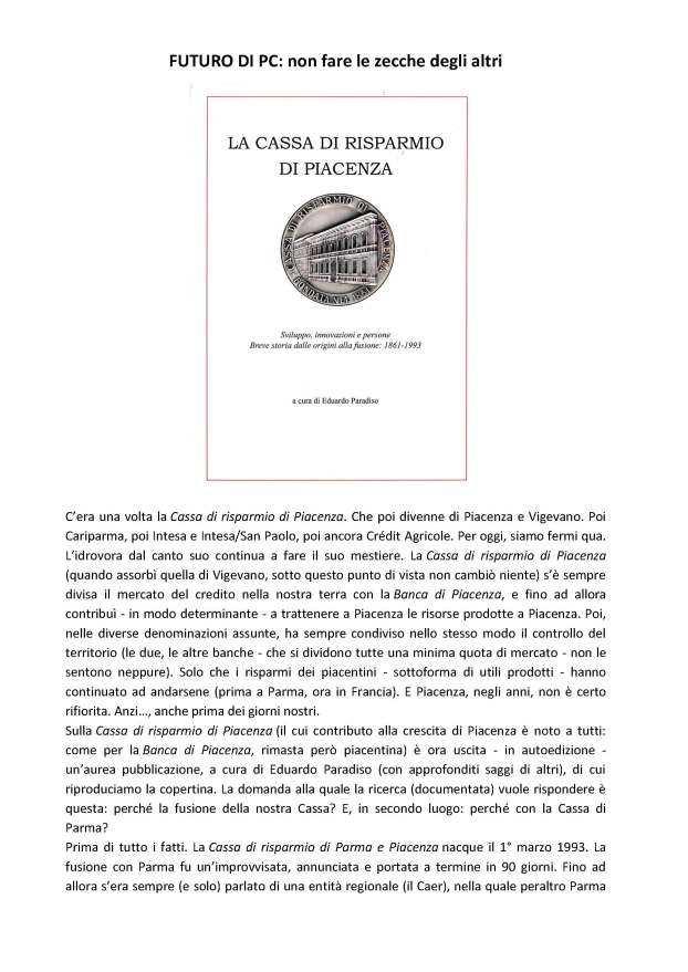 E chi ha giocato male la partita, si arrenda, e abbandoni il campo. Già si profila (e forse è anche già stata accettata) un’altra sconfitta, quella della Camera di commercio, che pure perderemo. E l’Expo è sulla stessa strada. Quello che è capitato con la nostra Cassa di risparmio lo abbiamo già visto: anche allora (ed è stata la madre di tutte le nostre seguenti sconfitte) si disse che ci avremmo guadagnato per questo e per quello. E’ chiaro che la partita dell’area vasta andava giocata in tutt’altro modo, con Reggio Emilia, e non anticipando invece decisioni (di chi?) di unioni con Parma.