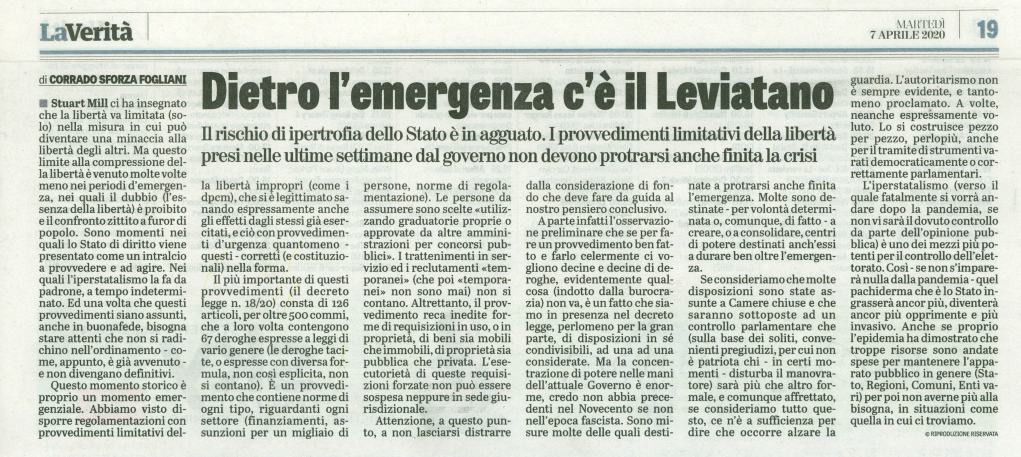 Articolo dell’avv. Corrado Sforza Fogliani, La Verità 07.04.2020